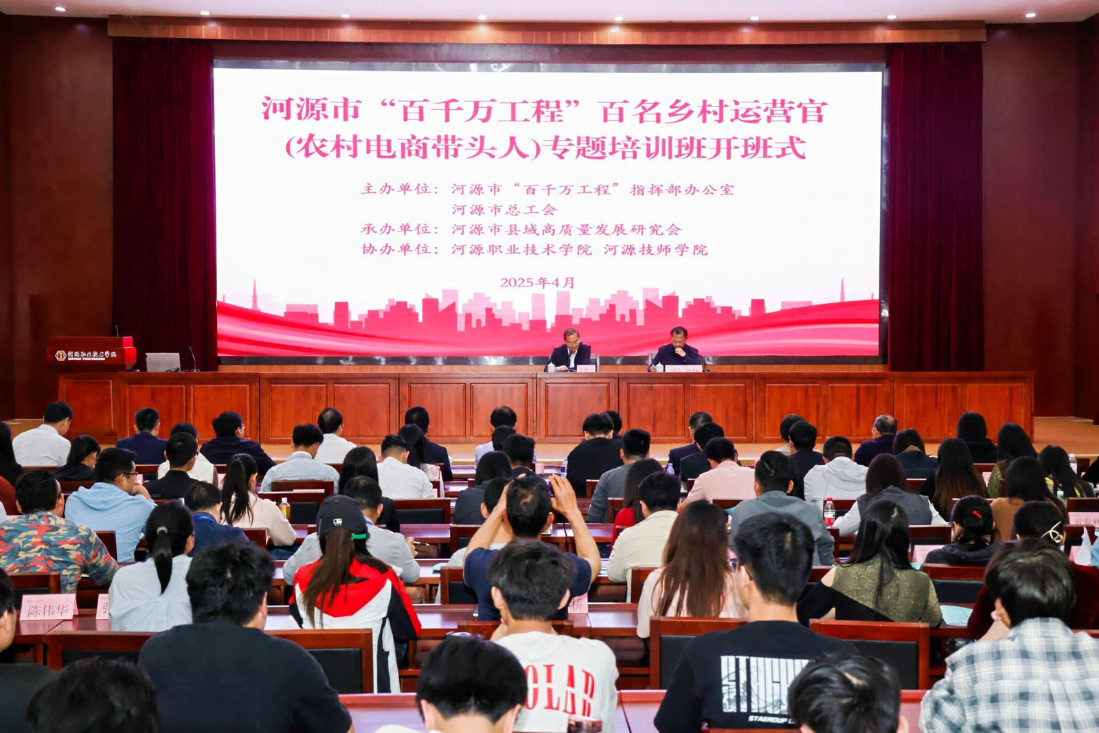 4月7日,河源市“百千万工程”百名乡村运营官(农村电商带头人)专题培训班开班式在我校学术交流中心报告厅举行。培训班由河源市“百千万工程”指挥部办公室与总工会主办、河源市县域高质量发展研究会承办、九州网与河源技师学院协办,市委副书记吴青川,我校校长刘贻新,市总工会常务副主席黄远程,市“百千万工程”指挥办、市人社局、市农业农村局、市商务局、市文广旅体局、河源技师学院、河源理工学校等分管负责同志以及106位农村电商带头人学员出席开班式。开班式由市人大常委会党组成员、副主任,市总工会主席钟壬旺主持。