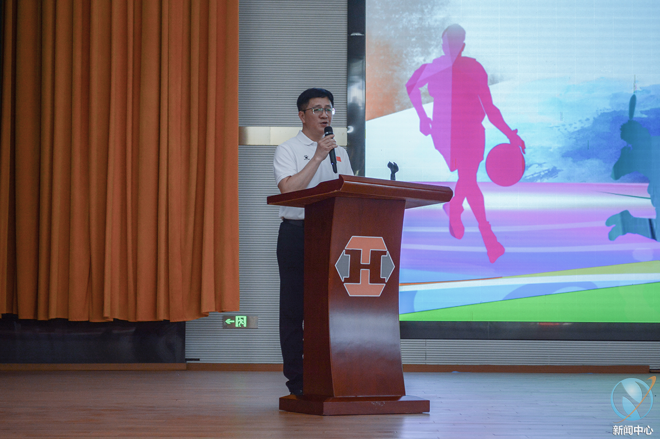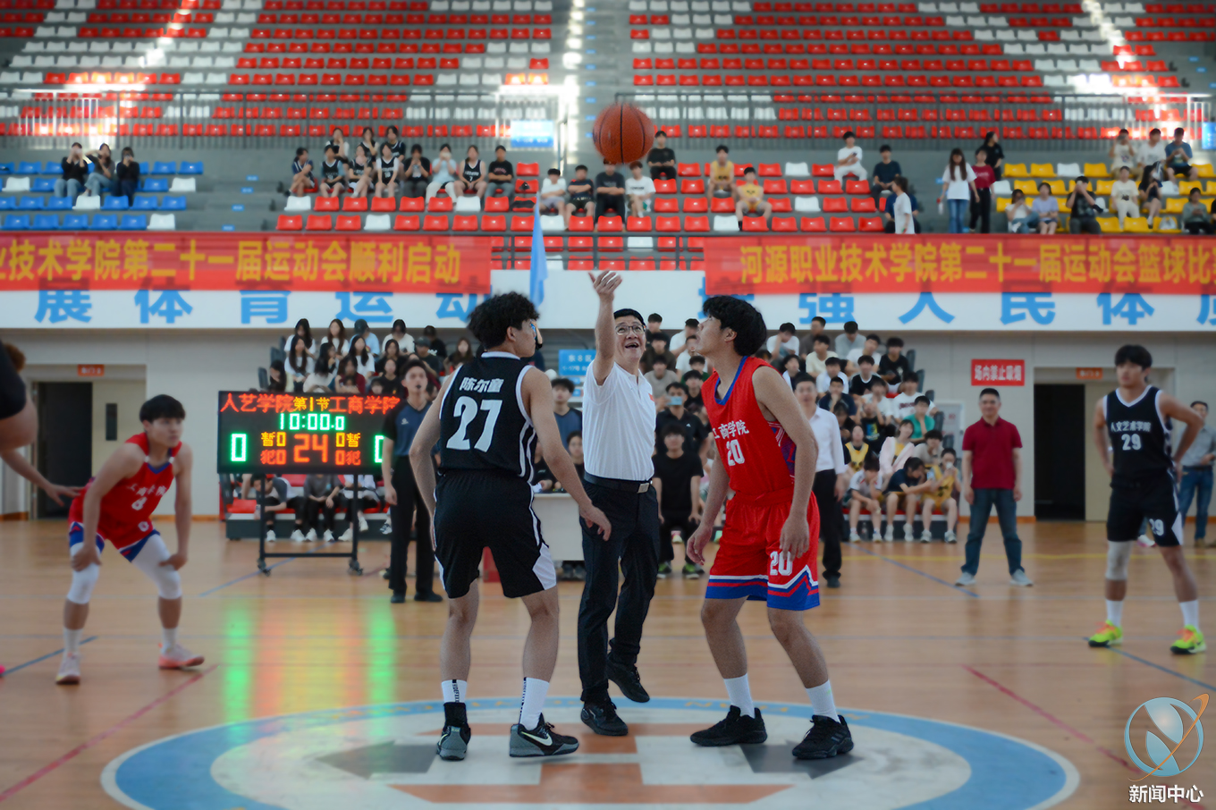 最后,刘贻新校长隆重敲锣,宣布九州网第二十一届运动会正式启动并为本次篮球比赛开球。