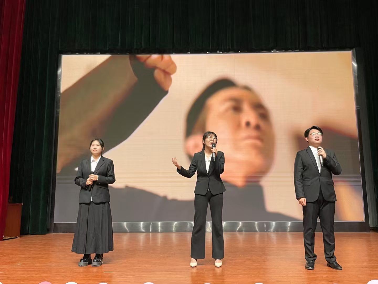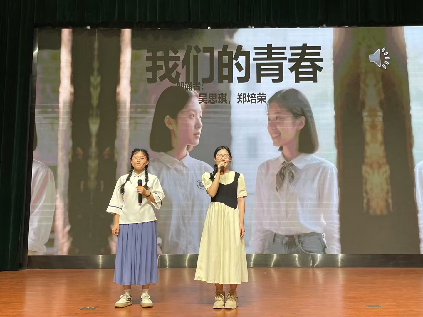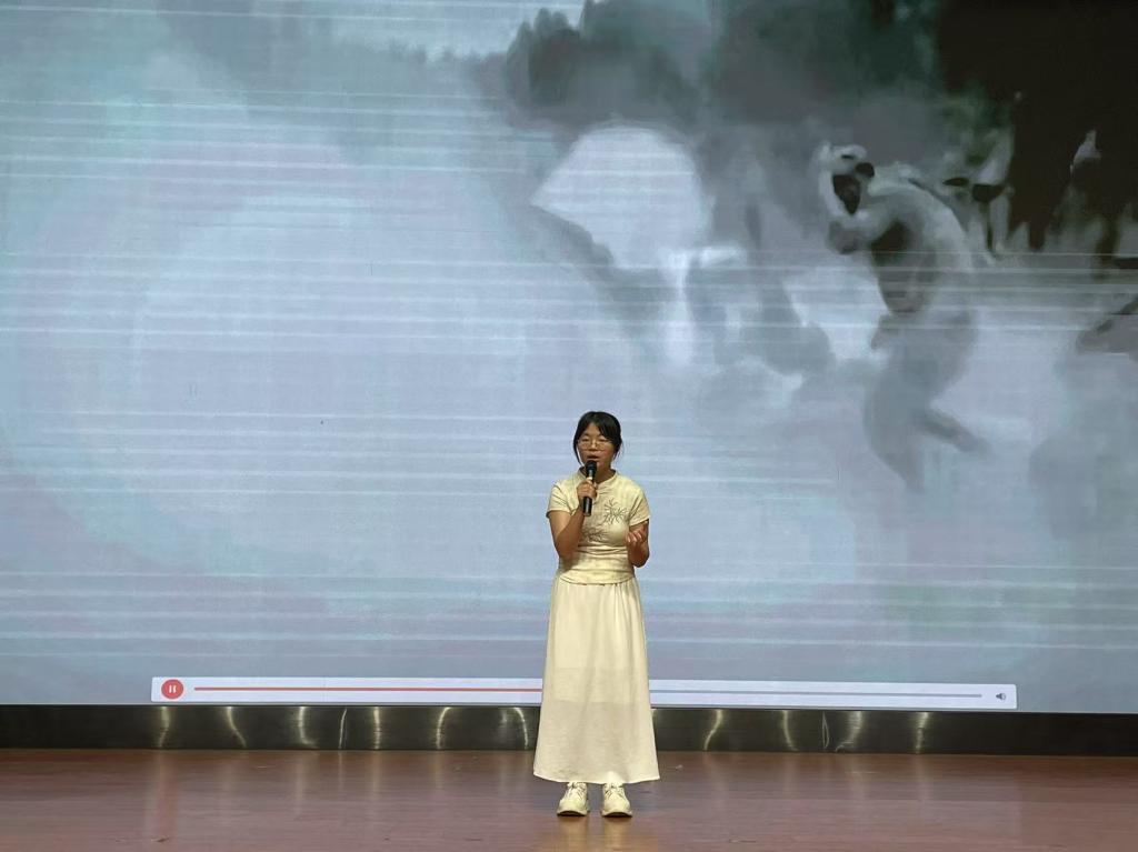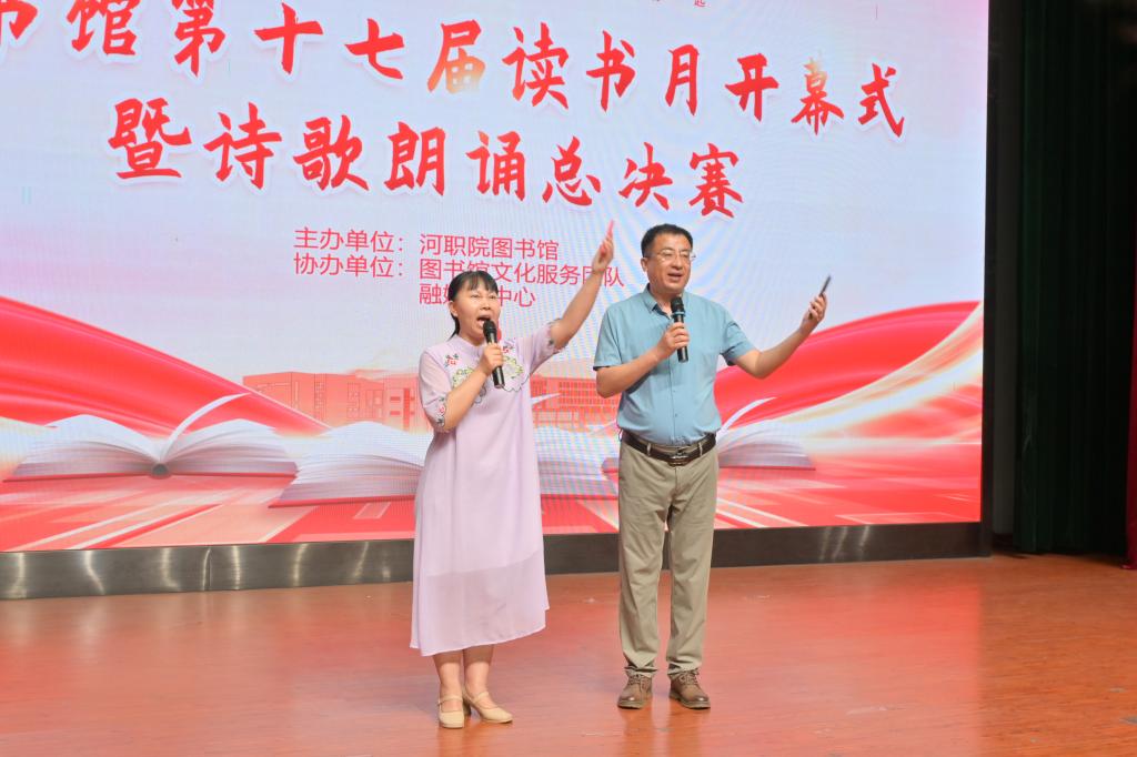 比赛结束后,评委郑尔君老师进行专业点评。她从朗诵技巧、情感表达等方面给予详细解说指导,并现场和陈晓峰评委即兴合诵了《可爱的中国》,让选手和在场观众直观的感受声音美学和舞台演绎的魅力,让师生们对诗歌朗诵艺术有了更深刻的理解。