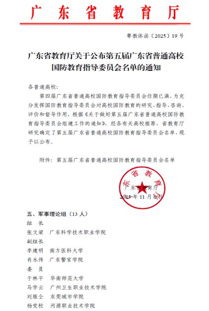 近日,广东省教育厅发布《广东省教育厅关于公布第五届广东省普通高校国防教育指导委员会名单的通知》,我校马克思主义学院负责人杨党校成功被遴选为该指导委员会委员。此次遴选工作于2024年11月启动申报,要求各高校推荐4至5名候选人参与。历经一年,全省170余所高校中最终仅65名专家当选为教指委委员。