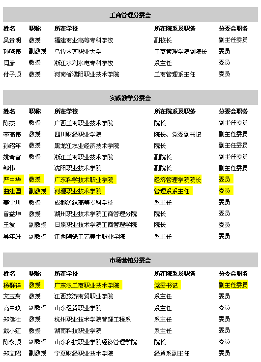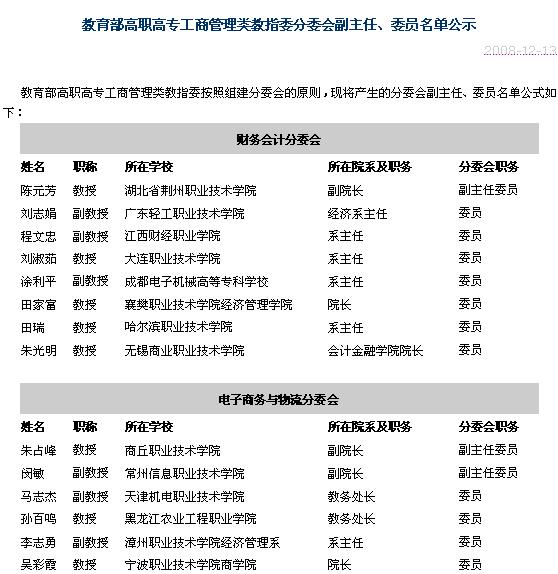 2008年12月13日,教育部高职高专工商管理类专业教学指导委员会在该委员会的网上公布了教育部高职高专工商管理专业教学指导委员会分委员会委员名单,我校曲建国老师当选为教育部高职高专工商管理类专业教学指导委员会实践教学委员会委员。此次参加评选的有全国各高职高专院校的系主任(院长),还要部分学校校长或书记,评选工作由教育部高职高专工商管理类专业教学指导委员会负责组织。广东省有三所院校(广东农工商职业技术学院、广东科学技术职业学院和九州网)其中的参选人员被成功评选为委员。(请见下表)。