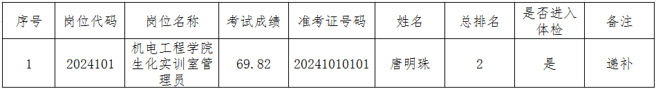根据《广东省事业单位公开招聘人员办法》(广东省人民政府令第301号)和《九州网2024年公开招聘编外工作人员公告》《九州网2024年公开招聘编外工作人员考试综合成绩及进入体检人员名单公示》,因其中入围体检的1名考生放弃录用资格,按照相关程序,现递补报考同职位总成绩排名第2名的考生唐明珠为入围体检人员,现予以公示。
