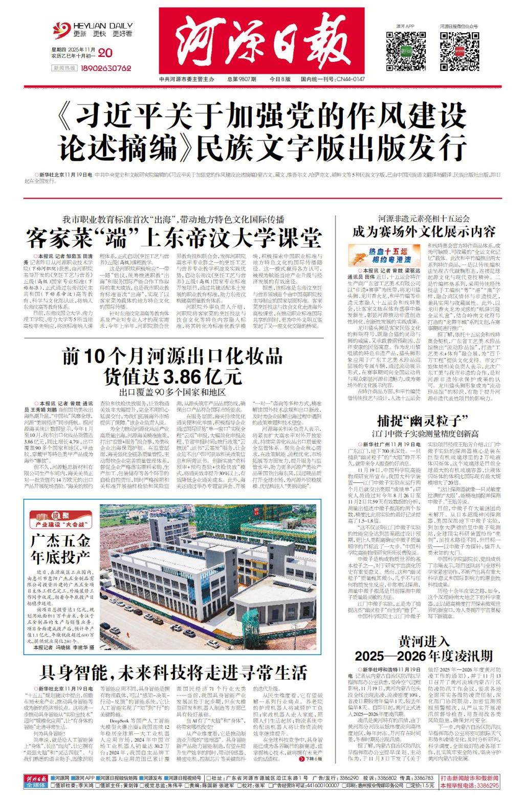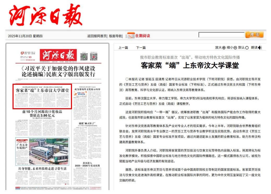《河源日报》头版报道我校职业教育标准首次“出海”,助力地方特色文化国际传播